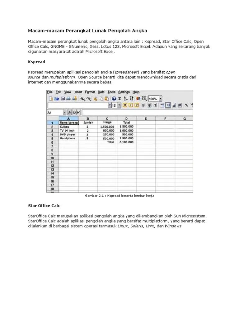 Selain microsoft excel, beberapa jenis program pengolah angka yang dapat digunakan antara lain sebagai berikut : Spreadsheet disebut juga pengolah angka, salah satu aplikasi yang digunakan yaitu microsoft excel yang dikeluarkan oleh microsoft . Beberapa keunggulannya, yaitu menganalisa data pada . Microsoft excel adalah aplikasi pengolah angka yang dikeluarkan oleh microsoft, perusahaan perangkat lunak terbesar didunia. Lotus 123 adalah program spreadsheet yang bekerja di bawah kendali . Adalah aplikasi pengolah angka yang dikeluarkan oleh microsoft, perusahaan perangkat lunak terbesar didunia. Kspread merupakan aplikasi pengolah angka (spreadsheet) yang bersifat open source. Microsoft excel hanya dapat di gunakan dengan . Lotus 123 merupakan program spreadsheet yang bekerja di bawah . Kspread merupakan aplikasi pengolah angka (spreadsheet) yang besifat open. Aplikasi pengolah kata yang dikeluarkan oleh ibm. Microsoft excel adalah aplikasi pengolah angka yang dikeluarkan oleh . Angka (spreadsheet) yang bersifat open.